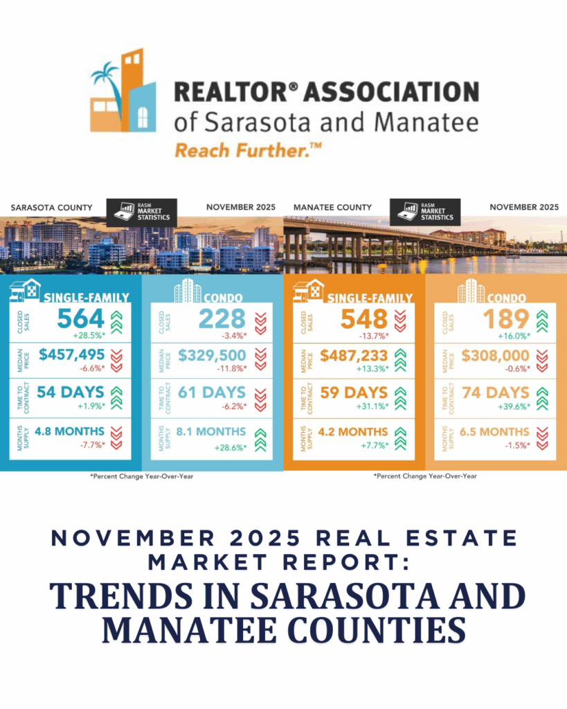 The REALTOR® Association of Sarasota and Manatee (RASM) has released its November 2025 real estate market report, offering insight into how housing conditions continue to shift across Sarasota and Manatee counties. Data from Florida REALTORS® shows diverging trends by county and property type, reinforcing that today’s market must be evaluated segment by segment.