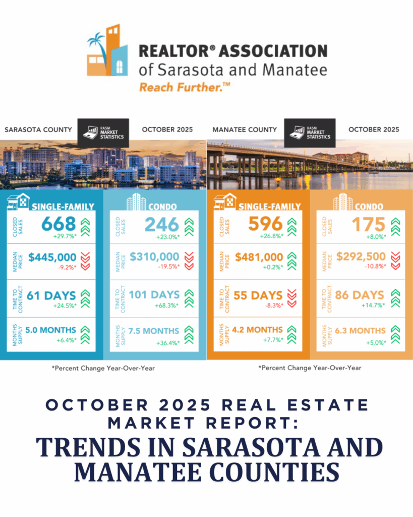 SARASOTA, Fla. (November 20, 2025) – The REALTOR® Association of Sarasota and Manatee (RASM) has released its October 2025 real estate market report, offering a detailed look at post-hurricane recovery trends across the region. According to data from Florida REALTORS®, the housing market in Sarasota and Manatee counties posted a strong year-over-year rebound in October, one year after Hurricane Milton disrupted closings and listings in fall 2024.